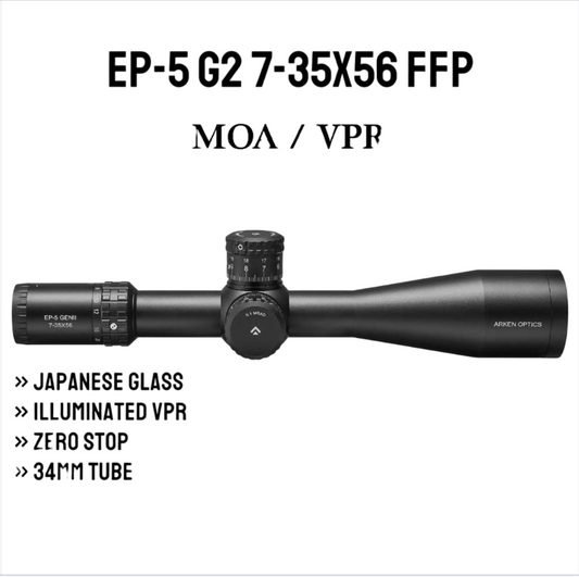 Arken Optics EP5 GEN2 7-35X56 RifleScope FFP VPR MOA Illuminated Reticle with Zero Stop 34mm Tube